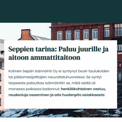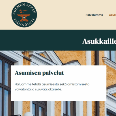 Suunnittelimme ja toteutimme uudelle isännöintitoimistolle, Kolmen Sepän Isännöinnille verkkosivut. Toimimme myös aloittelevan yrityksen kumppanina sen palveluiden markkinoinnissa ja näkyvyyden kasvattamisessa.